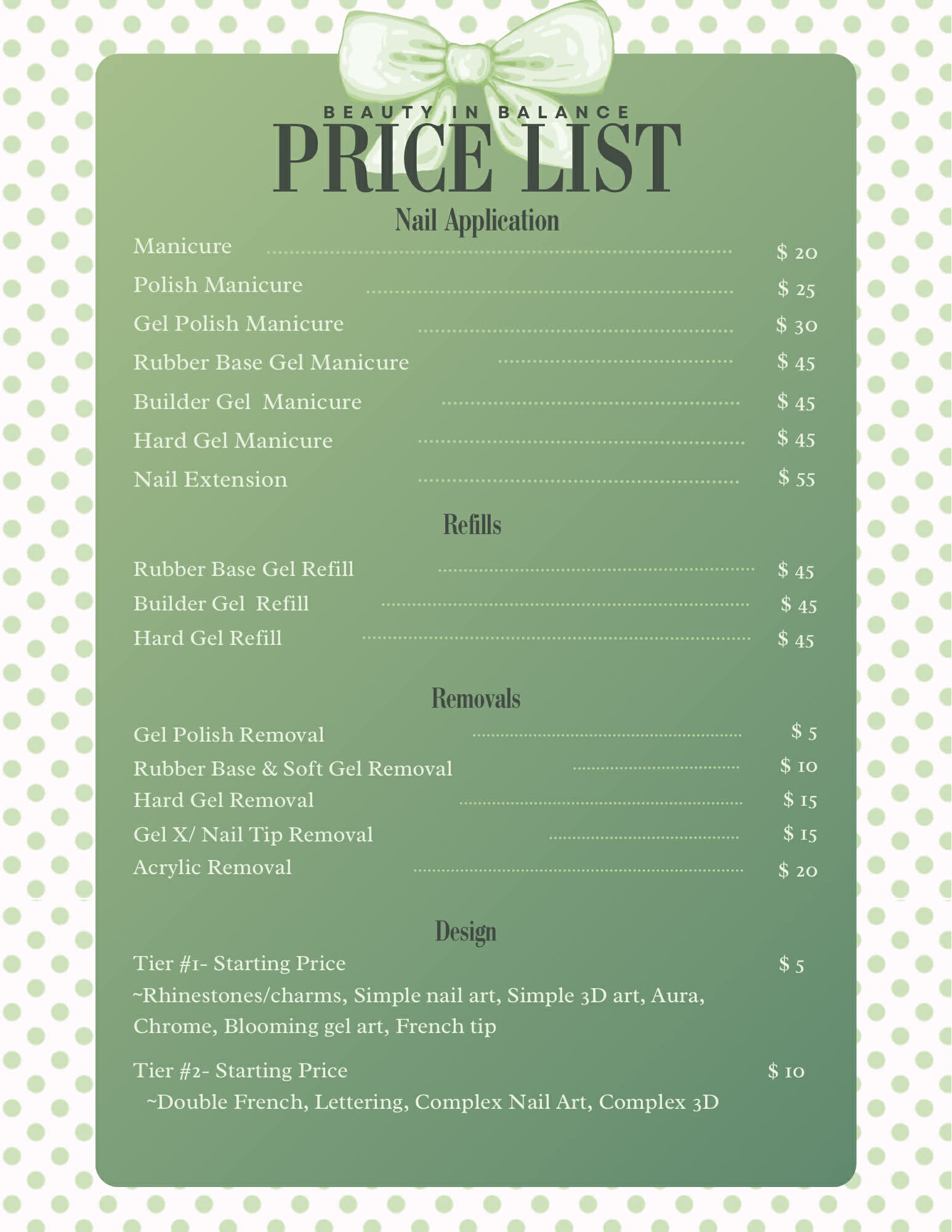 At Beauty In Balance, my goal is to create more than just beautiful nails — I’m here to provide an experience that leaves you feeling confident, relaxed, and cared for from start to finish.
